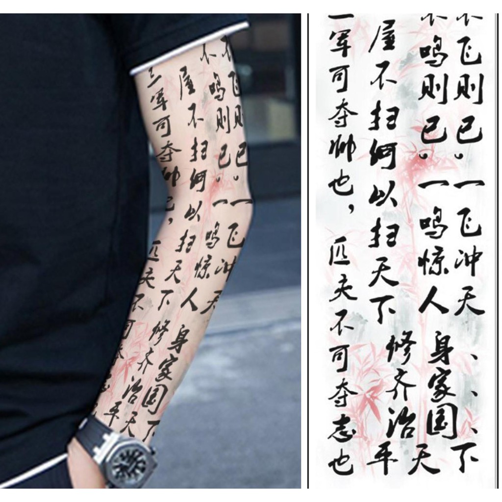 hình xăm dấu mộc đỏ chữ hán trên hai cánh tay.